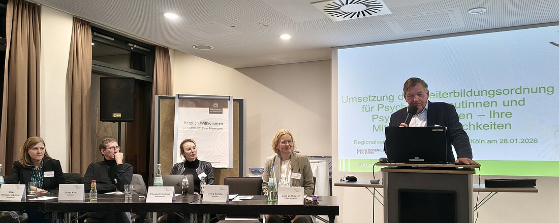 Wie lassen sich berufspolitische Entwicklungen transparent vermitteln – und zugleich Rückmeldungen aus der Praxis aufnehmen? Mit der Regionalversammlung bietet die Psychotherapeutenkammer Nordrhein-Westfalen hierfür einen Rahmen. In Köln kamen am 28. Januar 2026 im Stadthotel am Römerturm rund 50 Kammermitglieder mit dem Vorstand der Psychotherapeutenkammer Nordrhein-Westfalen ins Gespräch. Sie diskutierten aktuelle Themen, ordneten Herausforderungen ein und tauschten Erfahrungen und Eindrücke aus der täglichen Berufspraxis aus.