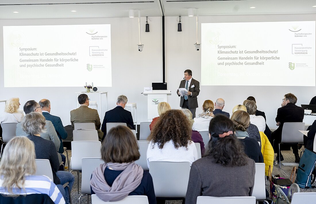 Was hat Klimaschutz mit heilberuflichem Handeln zu tun? Mehr, als vielen bewusst ist. Denn dort, wo Menschen unter Hitze, Stress oder Angst leiden, ist Gesundheit längst zu einem Gradmesser der Klimakrise geworden. Genau diesen Zusammenhang stellte die Psychotherapeutenkammer Nordrhein-Westfalen am 30. Oktober 2025 in den Mittelpunkt ihres Symposiums „Klimaschutz ist Gesundheitsschutz! Gemeinsam handeln für körperliche und seelische Gesundheit“.