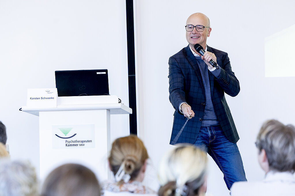 Fernsehmeteorologe Karsten Schwanke führte eindrucksvoll vor Augen, wie schnell sich die Erderwärmung beschleunigt. 2024 sei das 1,5-Grad-Limit bereits überschritten, Extremwetterereignisse nähmen rasant zu – auch in Nordrhein-Westfalen. Seine Beispiele aus dem Ahrtal (Hochwasser 2021), Bedburg (Überflutung 2025) und Valencia (Überschwemmungen 2024) machten deutlich, dass historische Wahrscheinlichkeiten nicht mehr gelten. Karsten Schwanke sprach von einer Wahrnehmungslücke: „Ein Grad klingt harmlos – aber es verändert alles.“ Seine Botschaft: Wenn Wetterextreme zum Alltag werden, verändern sich auch Angst, Belastung und Bewältigung – Themen, die zunehmend in therapeutischen Kontexten an Bedeutung gewinnen.