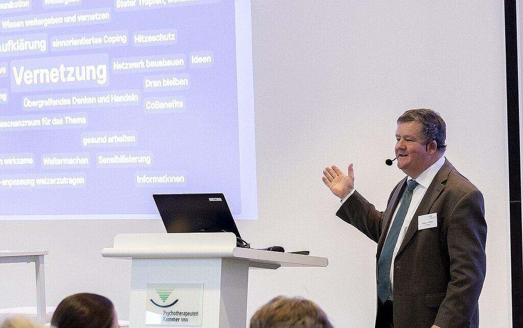 In seiner Eröffnungsrede nahm Andreas Pichler, Präsident der Psychotherapeutenkammer Nordrhein-Westfalen, das Thema aus übergeordneter Perspektive in den Blick. Der Klimaschutz stehe heute mehr denn je unter Druck – durch globale Krisen, wirtschaftliche Unsicherheiten und gesellschaftliche Spannungen. Die daraus erwachsenden Aufgaben zählten jedoch zum Kern verantwortlicher Zukunftsgestaltung. „Klimaschutz ist Gesundheitsschutz – und damit eine Überlebensfrage für die Menschheit“, hielt Andreas Pichler fest. Die Folgen des Klimawandels beträfen Körper und Psyche gleichermaßen: steigende Krankheitslasten, veränderte Krankheitsbilder, zunehmende seelische Belastungen.