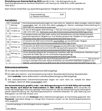 Bitte schicken Sie diesen Antrag zusammen mit Ihrem Selbsteinstufungsbogen sowie einer prüffähigen Kopie Ihres Einkommensteuerbescheids 2024 (s. a. den Punkt “Muss ich meinen Einkommensteuerbescheid 2024 beilegen?“) an die Geschäftsstelle der Psychotherapeutenkammer Nordrhein-Westfalen.